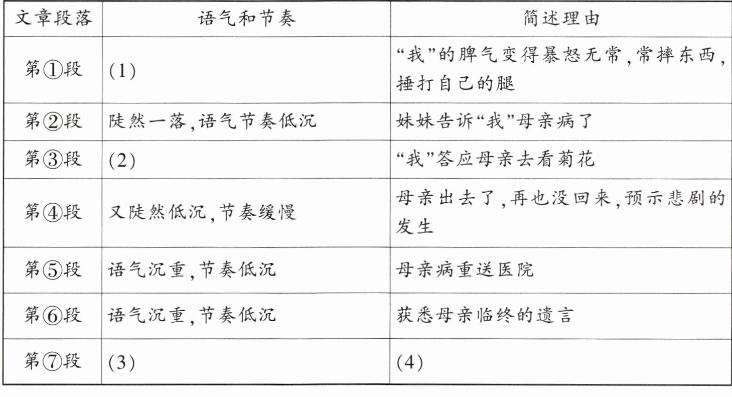 1.(1)语气激烈,节奏急促;(2)语气略带轻松,节奏稍快;(3)语气平静舒缓,节奏沉稳;(4)“我”和妹妹去看菊花,感悟到生命的美好,理解了母亲“好好儿活”的遗愿。2. 坚强。母亲自己肝疼得整宿睡不着,却一直瞒着“我”,在“我”暴怒时扑过来抓住“我”的手,忍住哭声劝慰“我”“好好儿活”,即使病重也始终为儿女着想,体现了她的坚强。3.(1)要像菊花一样,好好地活下去;(2)你们要好好儿活啊。4. 画线句描写了菊花的淡雅、高洁、热烈深沉,它们在秋风中开得烂漫,象征着生命的美好与顽强。“我”看到菊花,理解了母亲希望自己走出绝望、热爱生活的愿望,也感悟到要像菊花一样“好好儿活”,呼应了文章主题。