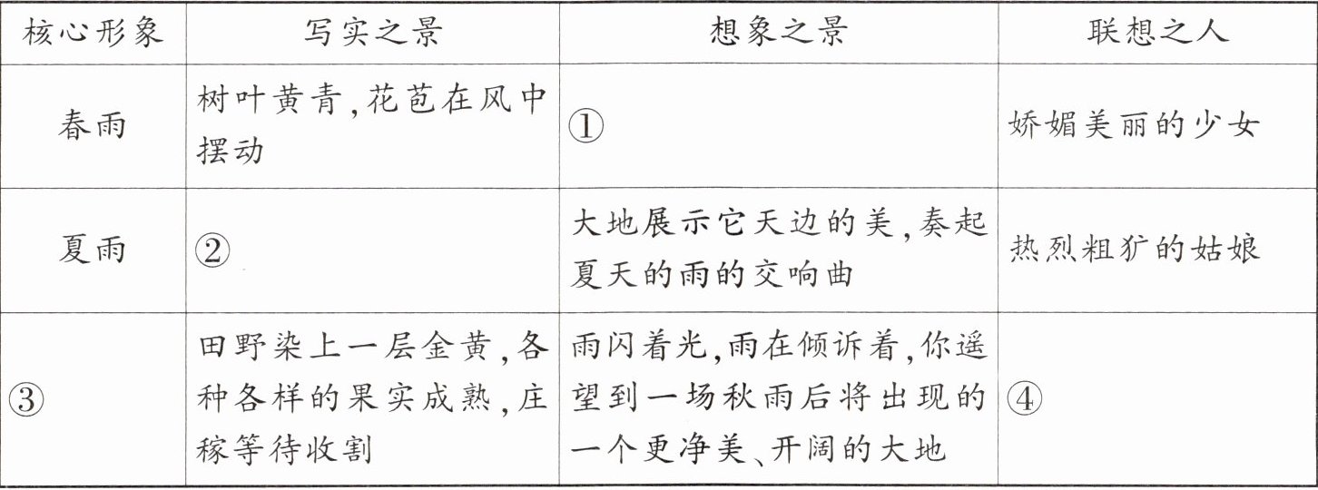 1.①万物复苏,小草偷偷探出脑袋,花儿竞相开放;②天上聚集几朵乌云,豆粒般的雨点打下来;③秋雨;④端庄沉静的母亲
