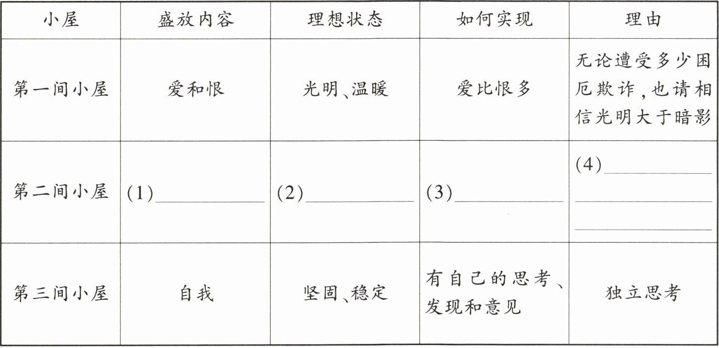 4. 如果让你设计自己的精神的小屋,你会怎样布置它们呢?结合文中关键语句和助读资料,联系实际谈谈自己的感悟和启示。