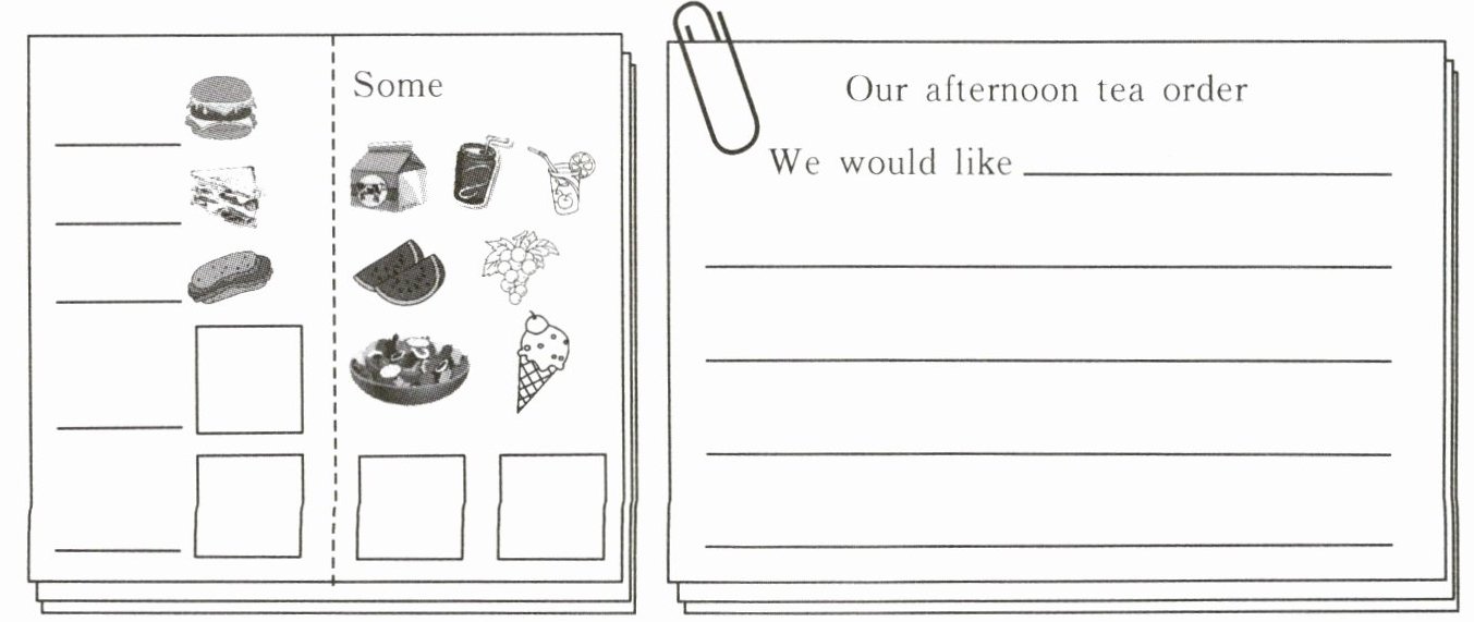三、点餐。在上一页的练习中,我们询问了小伙伴想要的下午茶。请你统计一下数量,写在相应的横线上,方框中可补充其他食物。然后写一写。