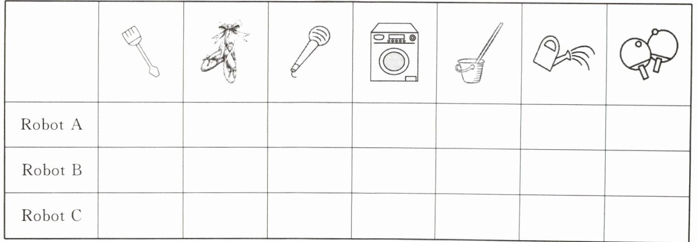 Robot A: I'm helpful. I can cook. I can clean the room. I can play ping-pong. I can water the flowers.