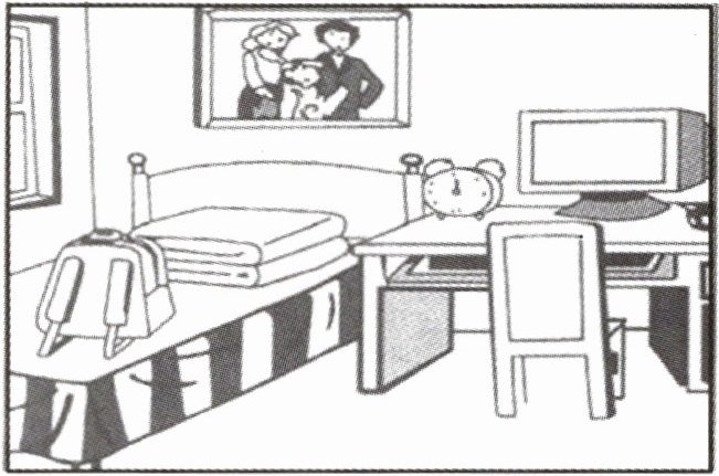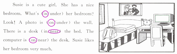 Susie is a cute girl. She has a nice bedroom. What's(in/under)her bedroom? Look! A photo is(on/under)the wall. There is a desk(in/near)the bed. The computer is(on/near)the desk. Susie likes her bedroom very much.