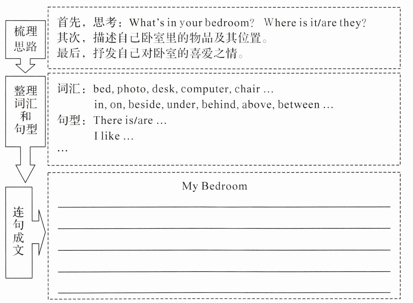 整理词汇和句型:词汇:bed, photo, desk, computer, chair ... in, on, beside, under, behind, above, between ... 句型:There is/are ... I like ... ...