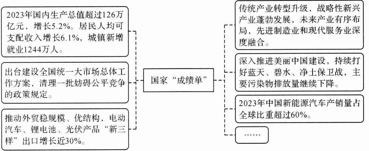 ⑤外贸方面:推动外贸稳规模、优结构,“新三样”出口增长近30%,中国新能源汽车产销量占全球比重超过60%,说明我国外贸结构优化,国际竞争力增强。