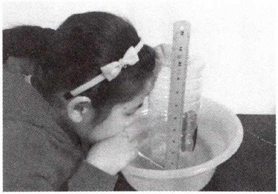 口含住长吸管的另一端,用力吹气,直至吹不动为止,记录大塑料瓶上水面对应的刻度,此即为肺活量。
