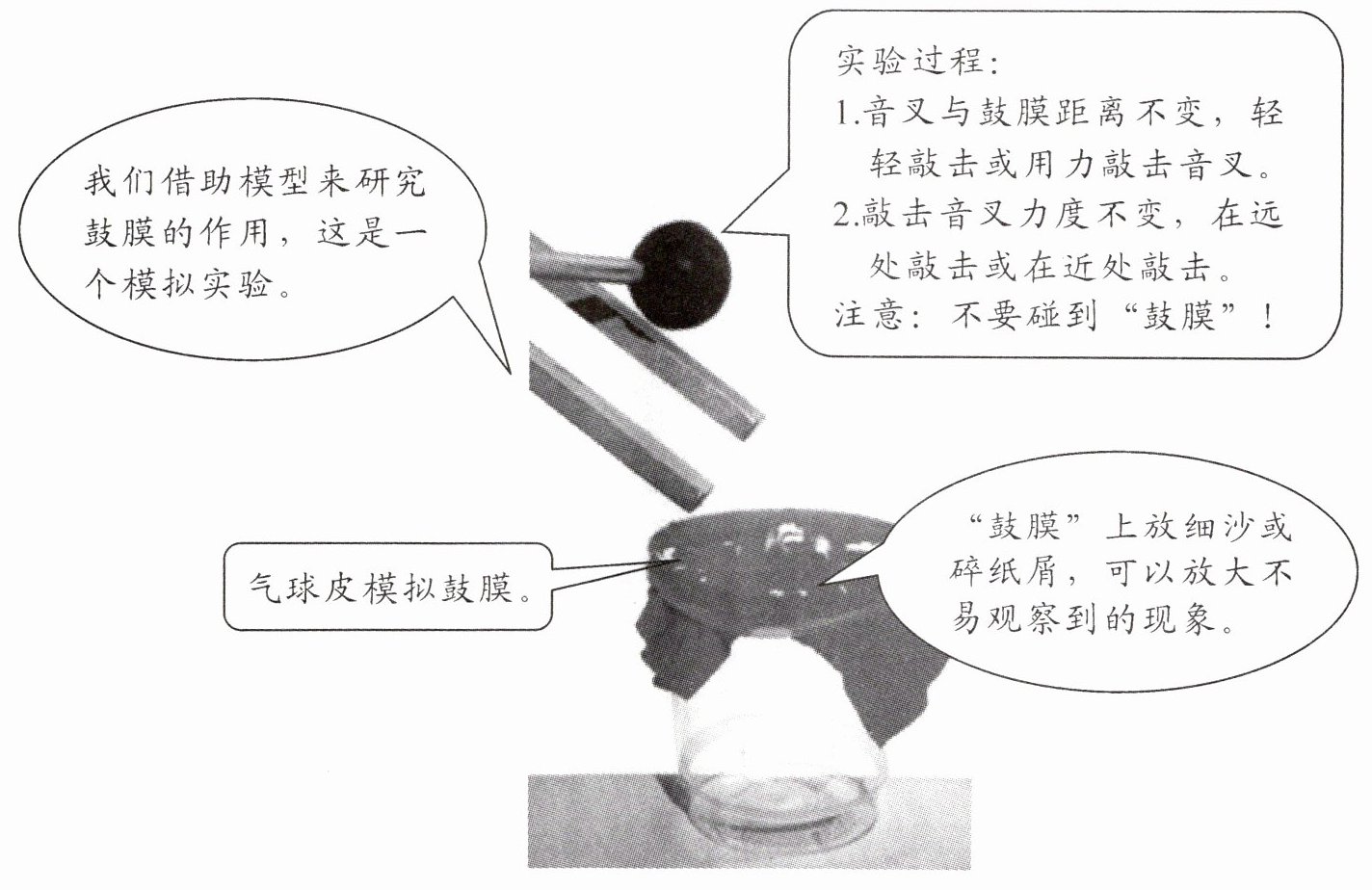 我们的发现:细沙(或碎纸屑)在“鼓膜”上______,说明音叉发出的声音通过______传递到了“鼓膜”。