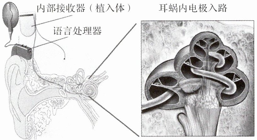 人工耳蜗由体外和体内两部分装置组成。体外的麦克风接收声信号,将声信号处理后,经皮肤传送到植入体内的接收线圈,再通过听神经传到听觉中枢进行辨别处理,从而产生听觉。