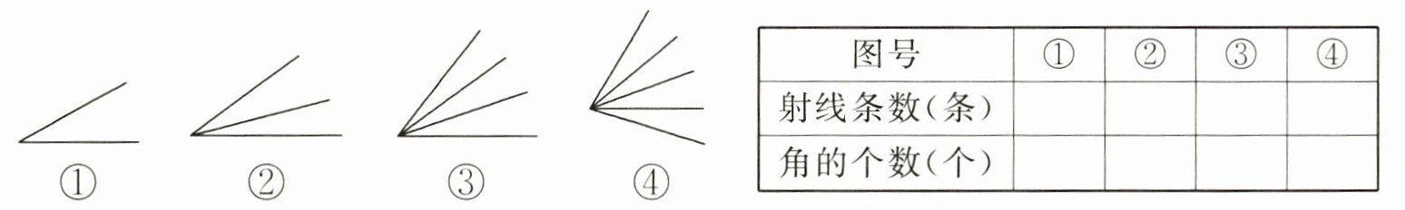 4. 数一数,下面各图中分别有几条射线?几个角?填在下表中。