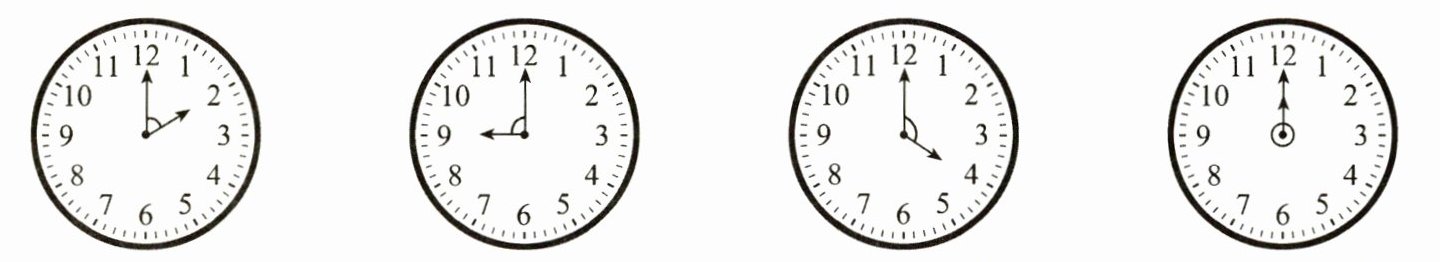 1. 写一写分针与时针所成的角各是多少度,分别是什么角。