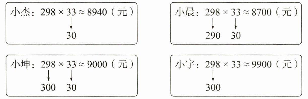 $\begin{array}{cc}\begin{array}{|c|}\hline小杰: 298×33\approx8940(元) \\\downarrow \\30 \\\hline\end{array}\\\hline & \begin{array}{|c|}\hline小晨: 298×33\approx8700(元) \\\downarrow \quad \downarrow \\290 \quad 30 \\\hline\end{array}\\\hline \\\\\begin{array}{|c|}\hline小坤: 298×33\approx9000(元) \\\downarrow \quad \downarrow \\300 \quad 30 \\\hline\end{array}\\\hline & \begin{array}{|c|}\hline小宇: 298×33\approx9900(元) \\\downarrow \\300 \\\hline\end{array}\\\hline \end{array}$