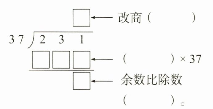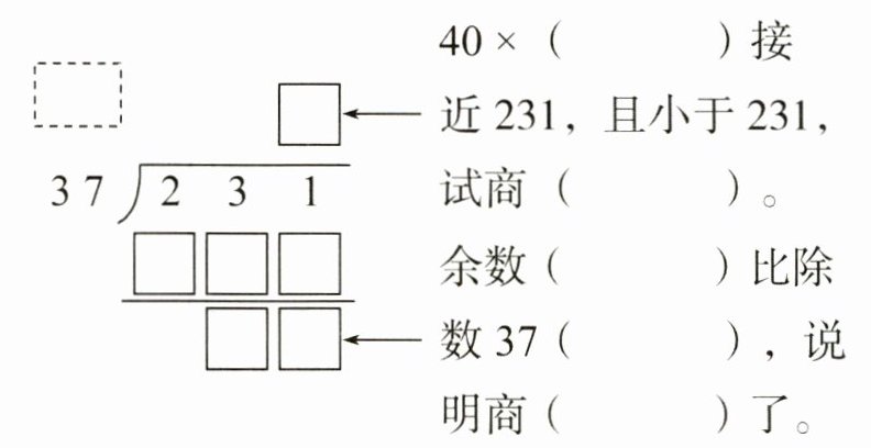 $40×( )$接近231,且小于231,试商( )。余数( )比除数37( ),说明商( )了。