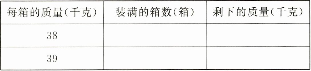 |每箱的质量(千克)|装满的箱数(箱)|剩下的质量(千克)|