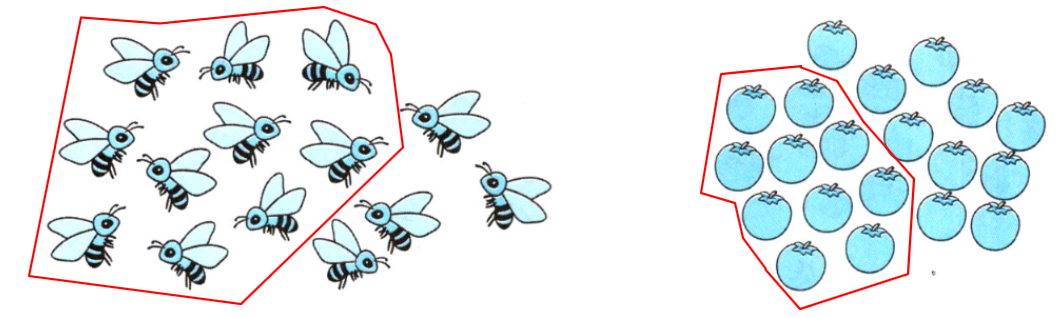 圈出10只蜜蜂,接着数剩下的蜜蜂有3只,10+3=13;圈出10个番茄(假设番茄图中圈出10个后剩余4个),10+4=14。