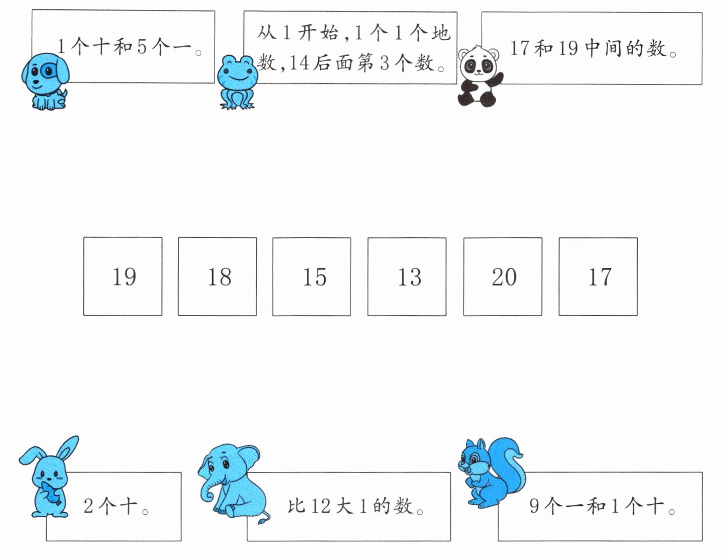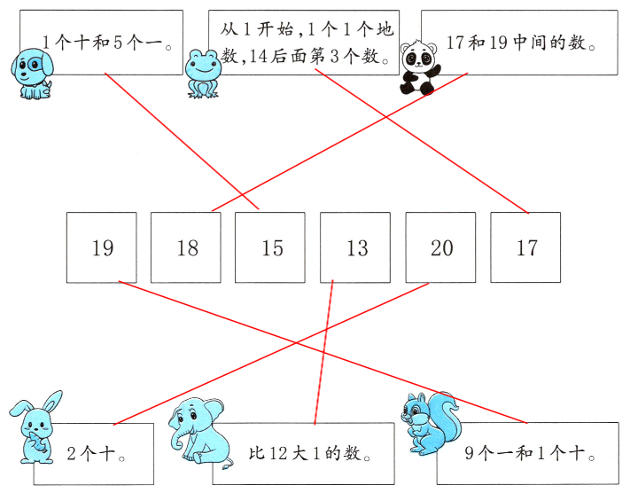 1个十和5个一:10+5=15;从1开始1个1个地数,14后面第3个数:14+3=17;17和19中间的数:18;2个十:10+10=20;比12大1的数:12+1=13;9个一和1个十:10+9=19。连线如下:狗-15,青蛙-17,熊猫-18,兔子-20,大象-13,松鼠-19。