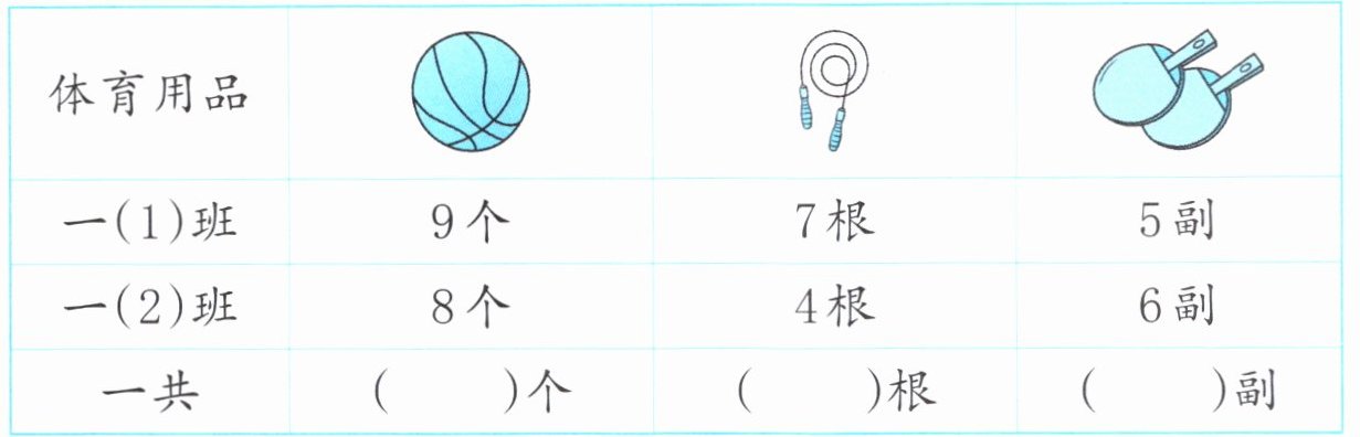 篮球:9+8=17(个);跳绳:7+4=11(根);乒乓球拍:5+6=11(副)