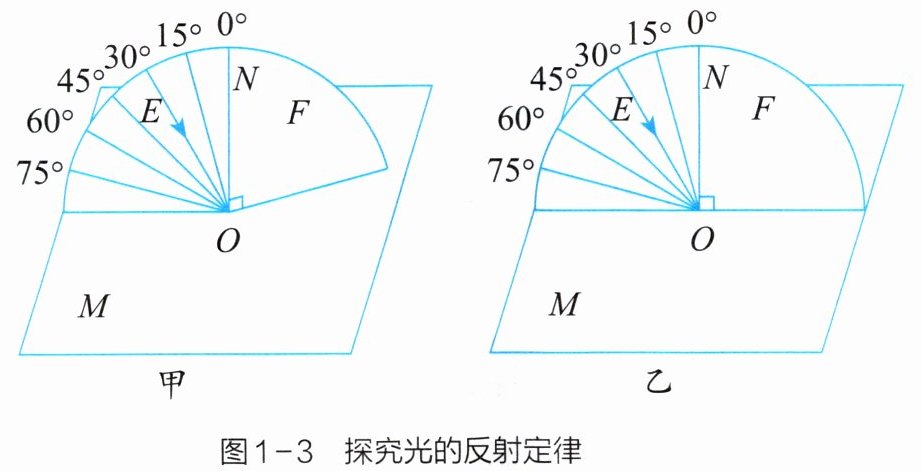 3. 使E、F两板处于同一平面,如图1-3乙所示,让一束光贴着纸板以30°入射角射向平面镜,经过平面镜的反射后,在纸板上用笔描出其反射光的路径。改变入射角为45°、60°,重复以上实验。