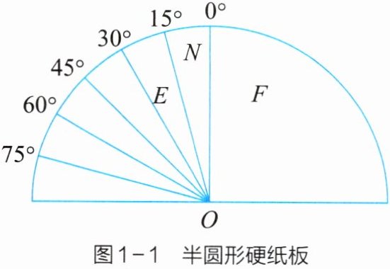 平面镜,可折叠的白色半圆形硬纸板(中间0°处有一条折痕,作为法线位置标记为N,标有角度的一侧为E,空白一侧为F,如图1-1所示),激光笔,量角器,直尺,喷雾瓶等。