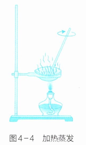 (1)如图4-4,将得到的澄清滤液倒入蒸发皿,把蒸发皿放在铁架台的铁圈上,利用酒精灯外焰加热,并用玻璃棒不断搅拌。