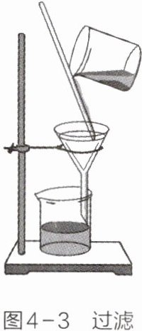 (4)如图4-3,将玻璃棒末端紧靠三层滤纸一边,盛有液体的烧杯口紧靠玻璃棒,把备好的悬浊液沿玻璃棒慢慢倒入漏斗,注意液面不能超过滤纸边缘。