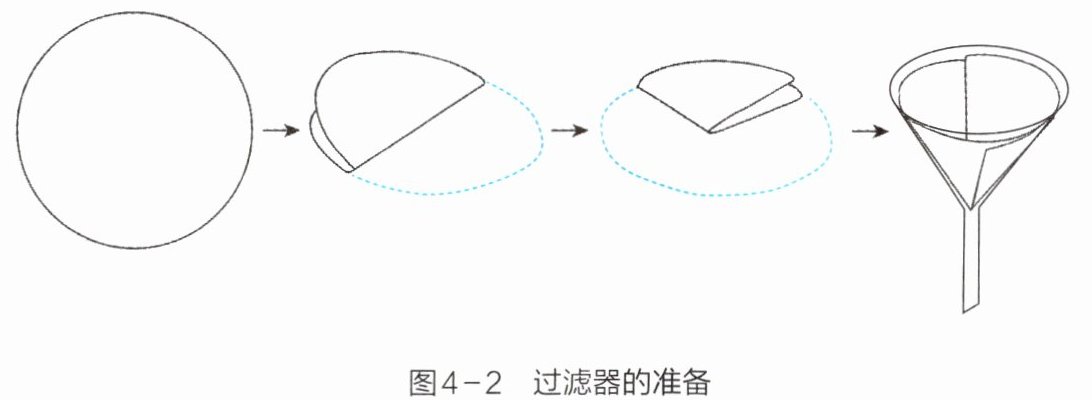 (1)如图4-2,把滤纸折成圆锥形(一边三层,一边一层)放入漏斗中,使之紧贴漏斗内壁。如果滤纸边缘高出漏斗口,要用剪刀剪去部分滤纸,使滤纸边缘略低于漏斗口。