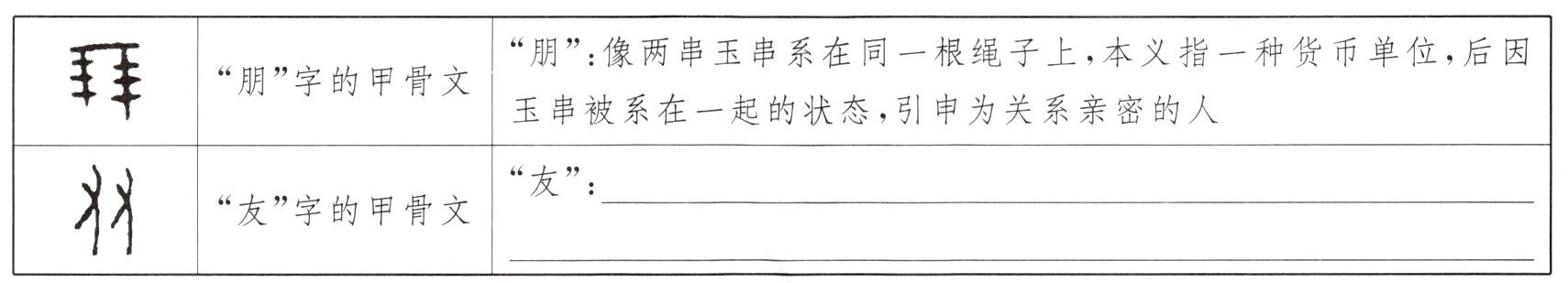 2. 小文查找了"朋友"二字的甲骨文,请你仿照表格中"朋"字的字源解说,对"友"字做字源解说。
