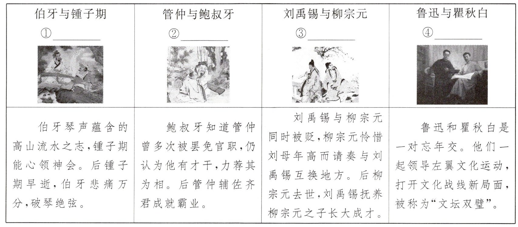 3. 小华搜集了下面的图片和故事,请你根据内容,选择恰当的主题词填入横线处,从而感受交友之道。