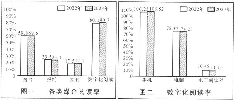 (2)数字化阅读会成为未来阅读的主要潮流。原因如下:从图一可以看出,数字化阅读率在上升;从图二可以看出,数字化阅读方式更加便捷、多样化,能够满足人们随时随地阅读的需求;随着科技的发展,电子设备的普及,数字化阅读将更加方便人们获取信息。