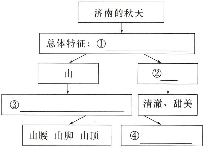 10. ①古朴、安静、秀美 ②水 ③颜色、方向、高矮不同 ④绿藻、鸭子 11. “自己”“甜美”重读(1 分),读出轻柔、宠溺的语气(1 分),表达出作者对济南秋日绿藻(水)的喜爱与赞美之情(1 分)。 12. 运用拟人的修辞手法(1 分),赋予绿藻以人的情态,“心事”“吻着”“香梦”生动形象地写出了绿藻的调皮、可爱(1 分),也从侧面表现了水的清澈(1 分)。 13.《济南的秋天》写水藻是为了从侧面突出秋水澄清、甜美的特点,表现出济南秋天的诗境。(2 分)《济南的冬天》写水藻是为了衬托冬水绿的特点和济南冬天温晴的特点,表现出济南冬天的无限生机和冬天孕育着的朦胧春意。(2 分)(意对即可)