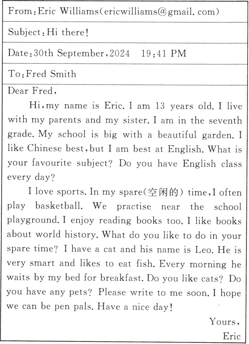 B)6. Williams. 7. Four. /There are four people. 8. Chinese. 9. He often plays basketball. 10. Eric's cat.