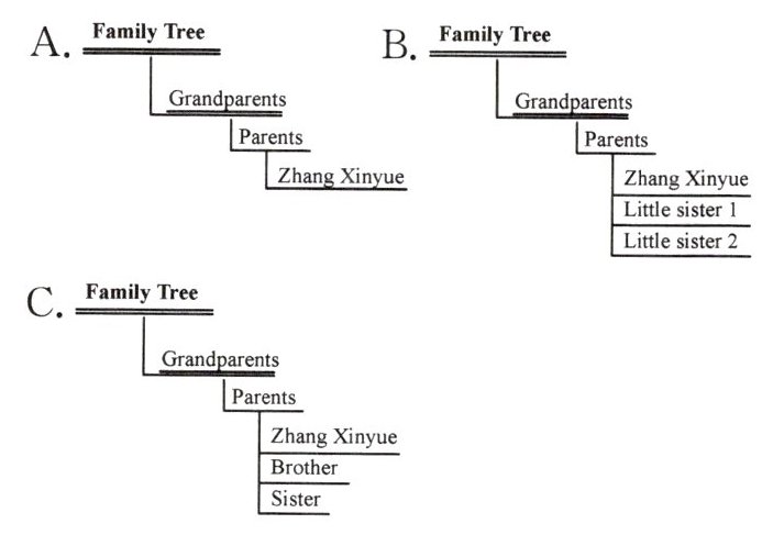 )20. 新考向 图片示意 Which of the following family trees matches(相符)Zhang Xinyue’s family?(
