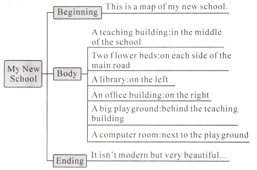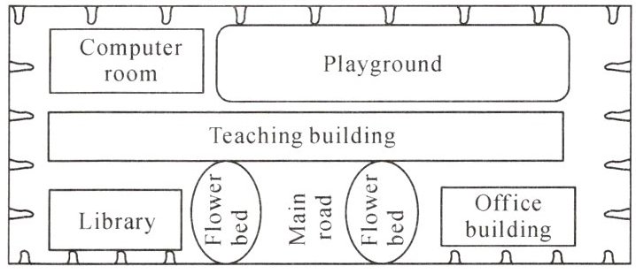 Thanks for your email. I’m glad to tell you something about my new school. This is a map of my new school. ①When you come into the school, you can see a tall teaching building ②in the middle of the school. ③There are two flower beds on each side of the main road. A library is ④on the left. I spend lots of time reading there. ⑤On the right, there is an office building. A big playground is ⑥behind the teaching building. We do exercises there every morning. You can find a computer room ⑦next to the playground.