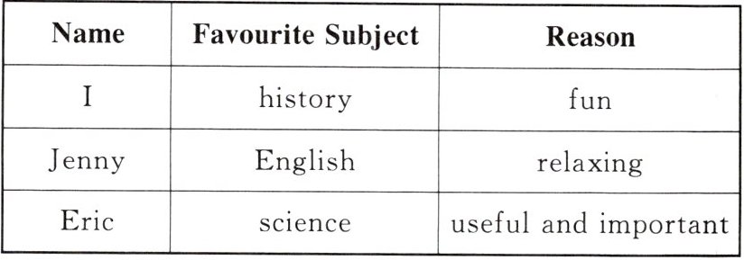 Body:①I: like history best; fun to learn about the past ②Jenny: likes English; relaxing ③Eric: likes science; useful and important