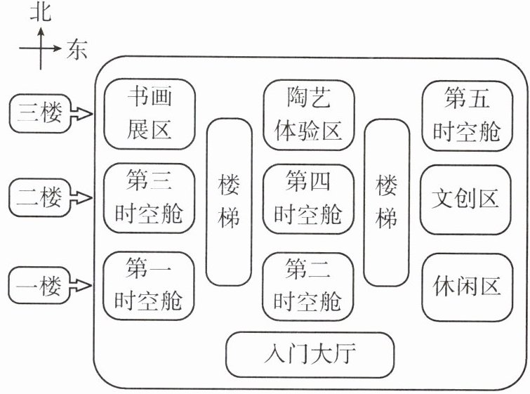 (1)你在第一时空舱门口遇到一位老人,他问你到第五时空舱怎么走,请你根据下面的平面图,为他指明路线。
