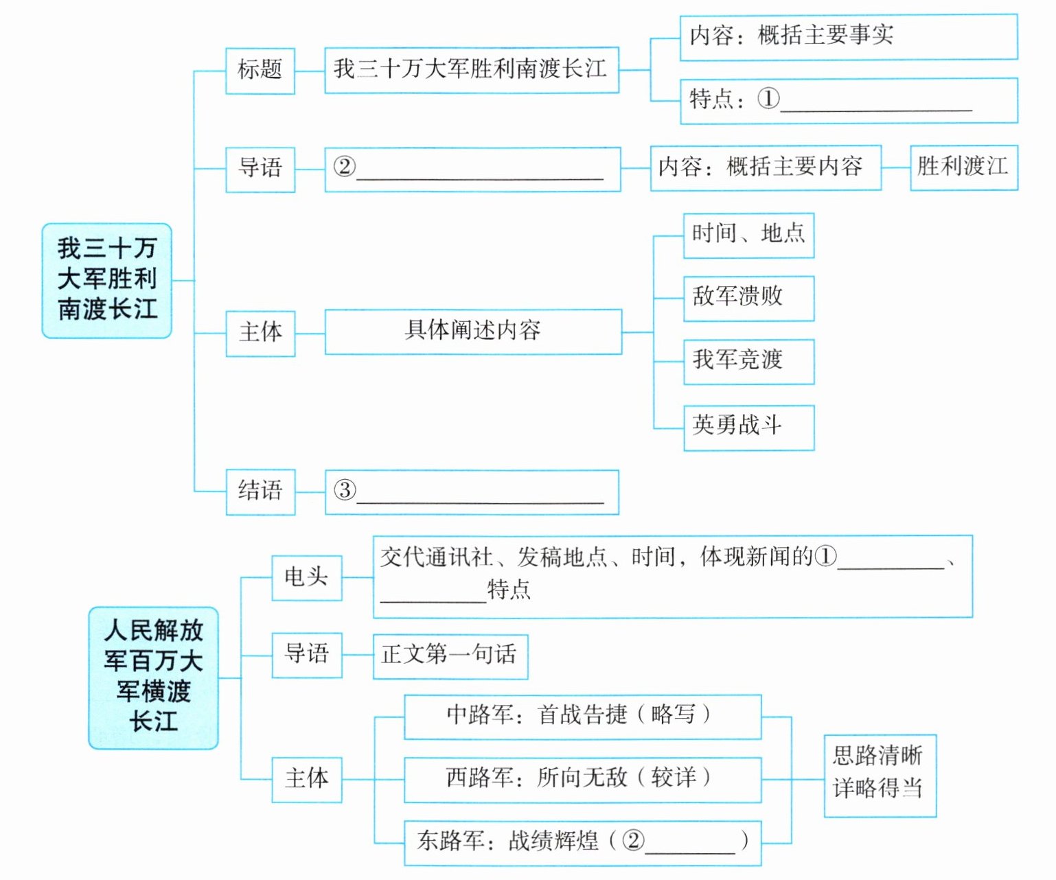 《我三十万大军胜利南渡长江》:①简明、醒目,概括性强 ②英勇的人民解放军二十一日已有大约三十万人渡过长江 ③发出战斗号召