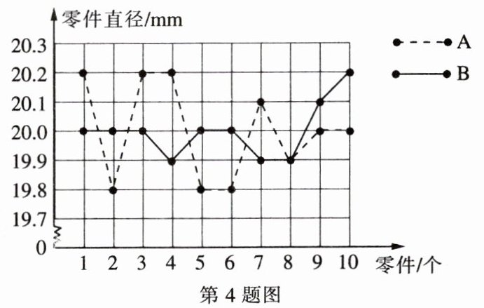 4. 为选派一名学生参加全市实践活动技能竞赛,A,B两名同学在学校实习基地现场进行加工直径为20mm的零件的测试,他俩各加工10个零件的相关数据如下图表所示。根据测试得到的有关数据,试解答下列问题: