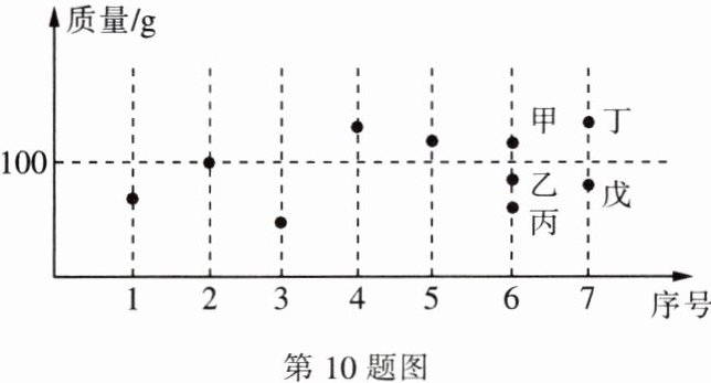 10. (2024·苏州)某公司拟推出由7个盲盒组成的套装产品,现有10个盲盒可供选择,统计这10个盲盒的质量如图所示。序号为1到5号的盲盒已选定,这5个盲盒质量的中位数恰好为100g,6号盲盒从甲、乙、丙中选择1个,7号盲盒从丁、戊中选择1个,使选定7个盲盒质量的中位数仍为100,可以选择( )