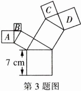 3. 如图,所有的四边形都是正方形,所有的三角形都是直角三角形,其中最大的正方形的边长为 $7$ cm,则正方形 $A$,$B$,$C$,$D$ 的面积之和为 $\underline{\quad\quad}$ $cm^2$。