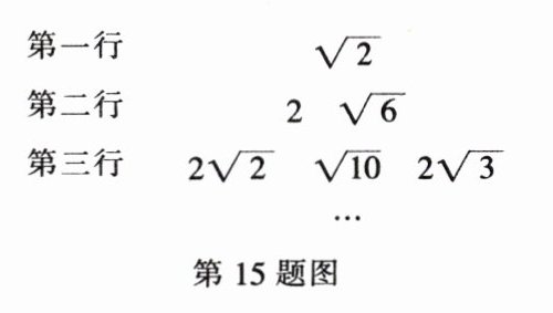 15. (2024·德阳)将一组数$\sqrt{2}$,$2$,$\sqrt{6}$,$2\sqrt{2}$,$\sqrt{10}$,$2\sqrt{3}$,…,$\sqrt{2n}$,…,按如图所示方式进行排列,则第八行左起第1个数是( )