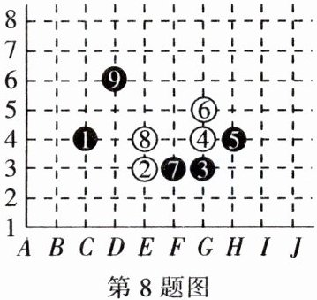 解:(1)黑棋⑧记为(G,3),黑棋⑤记为(H,4),黑棋⑨记为(D,6)。 (2)白棋⑧,黑棋⑦,白棋⑥。