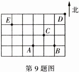 9. 在如图所示的一个网格中,如果用(4,2)表示点A的位置,请依照这种表示方法表示点B,C,D,E的位置。如果以点A为中心,你还可以用什么方法确定点B,C,D,E的位置?请你具体表示出来。(图中每个小正方形的边长为1cm)