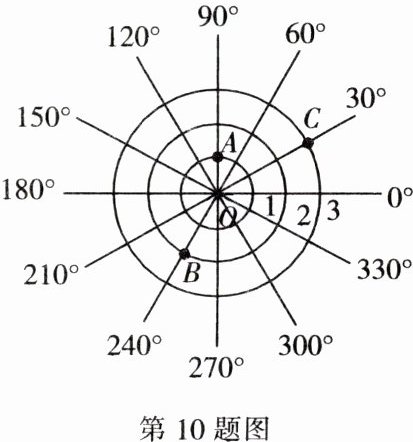10. (2024·甘孜) 如图,在一个平面区域内,一台雷达探测器测得在点A,B,C处有目标出现。按某种规则,点A,B的位置可以分别表示为(1,90°),(2,240°),则点C的位置可以表示为______。