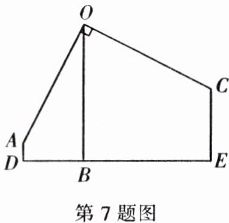 7. 如图是高空秋千的示意图,小李从起始位置点 $A$ 处绕着点 $O$ 经过最低点 $B$,最终荡到最高点 $C$ 处。若 $\angle AOC = 90°$,点 $A$ 与点 $B$ 的高度差 $AD = 1$ m,水平距离 $BD = 4$ m。求点 $C$ 与点 $B$ 的高度差 $CE$。