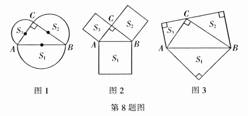 8. 如图 1,分别以 $Rt\triangle ABC$ 的三条边为直径向外作三个半圆,其面积分别用 $S_1$,$S_2$,$S_3$ 表示,则 $S_1 = S_2 + S_3$。