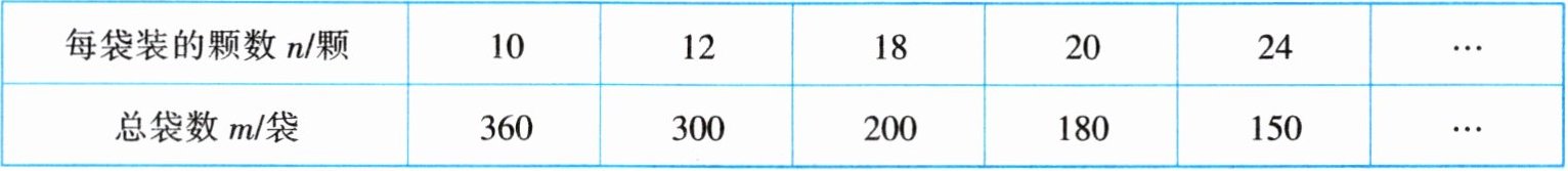 解:(1)反映总袋数 m 与每袋装的颗数 n 两个变量之间的关系,其中每袋装的颗数 n 是自变量。(2)这批水果糖共有 10×360=3 600(颗)。总袋数随着每袋装的颗数的增多而减少。(3)