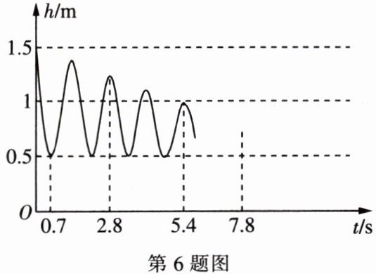 6. 荡秋千时,秋千离地面的高度 $ h \ (m) $ 与摆动时间 $ t \ (s) $ 之间的关系如图所示。