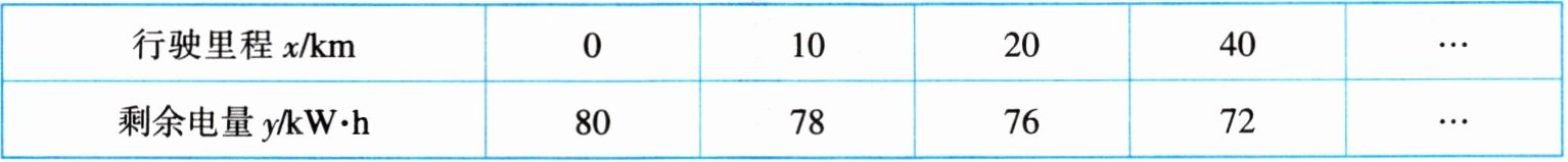 ∴行驶里程每增加 1 km,剩余电量减少 0.2 kW·h。当 x=0 时,y=80,则 y=80-0.2x。