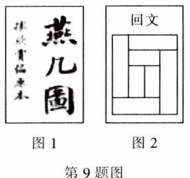 9. (2024·甘肃) 如图 1,“燕几”即宴几,是世界上最早的一套组合桌,由北宋进士黄伯思设计。全套“燕几”一共有七张桌子,包括两张长桌、两张中桌和三张小桌,每张桌面的宽都相等。七张桌面分开可组合成不同的图形。如图 2 给出了《燕几图》中名称为“回文”的桌面拼合方式,若设每张桌面的宽为 $ x $ 尺,长桌的长为 $ y $ 尺,则 $ y $ 与 $ x $ 之间的关系可以表示为( )