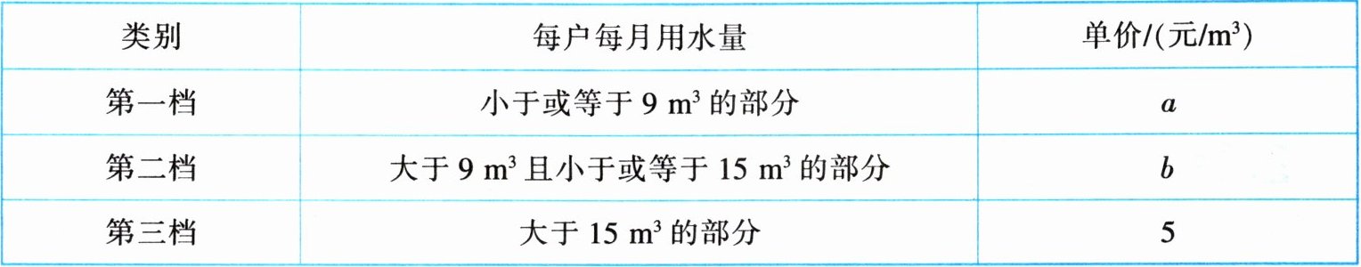 该市某户居民今年 $ 5 $,$ 6 $ 月的用水量为 $ 7 m^3 $,$ 12 m^3 $,分别缴纳水费 $ 21 $ 元和 $ 39 $ 元。
