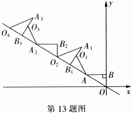 13. (2024·内江) 如图,在平面直角坐标系中,$ AB \perp y $ 轴,垂足为点 $ B $,将 $ \triangle ABO $ 绕点 $ A $ 逆时针旋转到 $ \triangle AB_1O_1 $ 的位置,使点 $ B $ 的对应点 $ B_1 $ 落在直线 $ y = - \frac{3}{4}x $ 上,再将 $ \triangle AB_1O_1 $ 绕点 $ B_1 $ 逆时针旋转到 $ \triangle A_1B_1O_2 $ 的位置,使点 $ O_1 $ 的对应点 $ O_2 $ 也落在直线 $ y = - \frac{3}{4}x $ 上,如此下去,…$ $,若点 $ B $ 的坐标为 $ (0, 3) $,则点 $ B_{37} $ 的坐标为( )