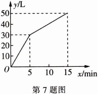 7. (2024·哈尔滨) 一个有进水管与出水管的容器,从某时刻开始5min内只进水不出水,在随后的10min内既进水又出水,每分钟的进水量和出水量是两个常数。容器内的水量y(L)与时间x(min)之间的关系如图所示,当 $ x = 9min $ 时, $ y = (\quad) $
